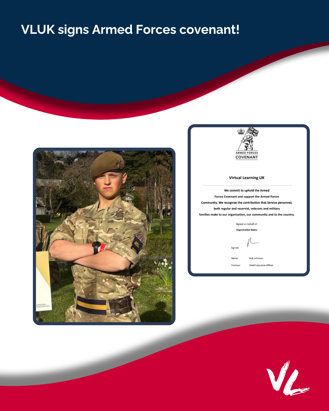 Armed Forces Covenant Posted on 04 September 2025 We’re proud to announce that VLUK has officially signed the Armed Forces Covenant - a pledge to support learners from the Armed Forces community both during and beyond their education. One of our learners, Dylan, shared what this means to him: "As an army cadet and with my army application in, the Armed Forces Covenant means an awful lot to me. The support it offers both the organisation and myself is outstanding. VLUK signing the covenant really shows what the organisation is all about—it's not just about sport or the study programme, but about developing good citizens." VLUK are committed to making a difference where it counts.