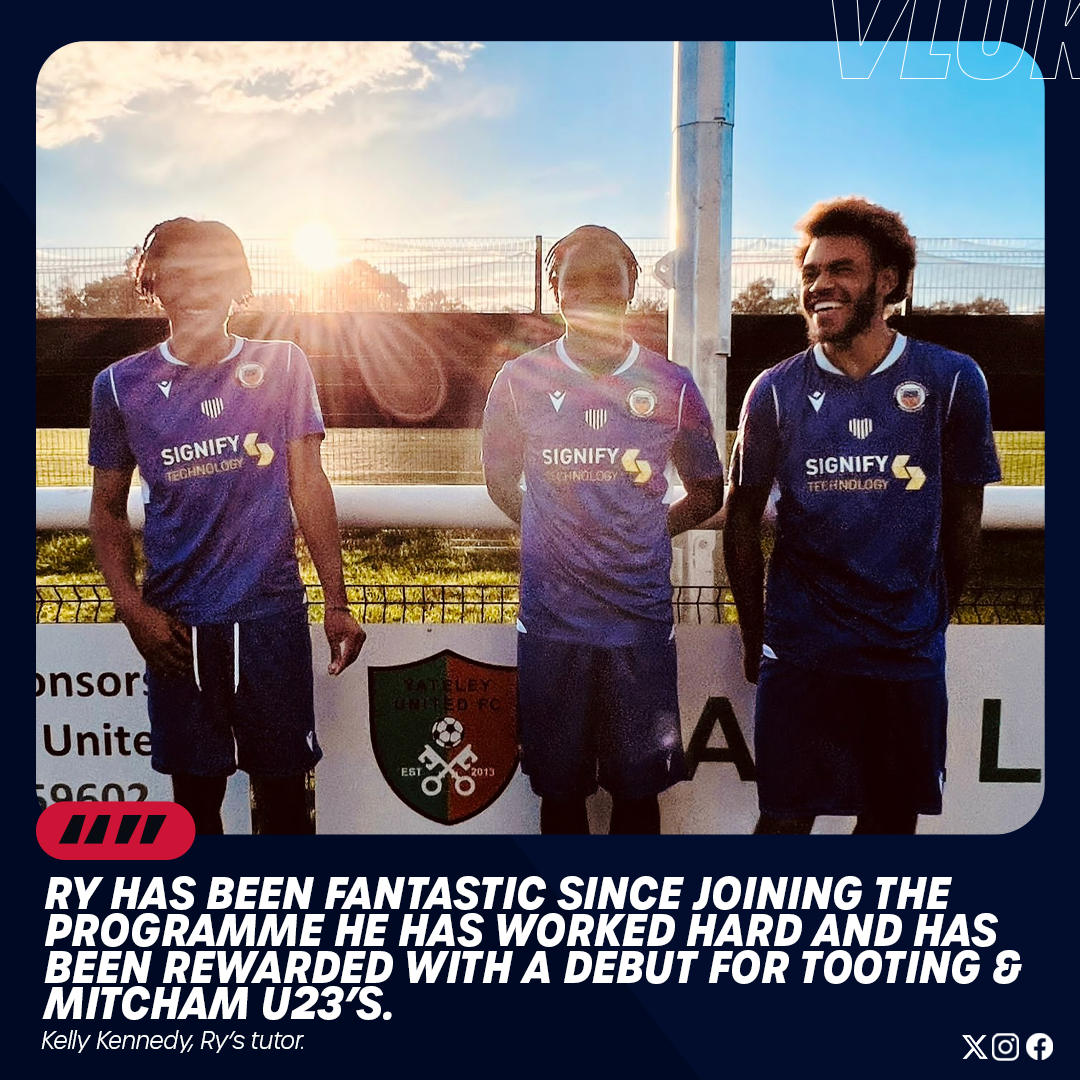 Debut Posted on 14 November 2023 Ry enrolled on the study prgramme based at the VLUK Tooting & Mitcham campus in September 2023. After showing promise and dedication during his enrichment sessions and when representing the scholarship team during Wednesday afternoon fixtures, Ry was invited to train with the Tooting & Mitcham Under 23’s. Ry made his Debut for the U23’s against Yateley FC on the 14th October. Kelly Kennedy Ry’s tutor said, "Ry has been fantastic since joining the programme both in the classroom and practically. He has worked hard and has been rewarded with a debut for a successful and well established Tooting & Mitcham under 23 team. Well done Ry". Ry pictured in the middle.