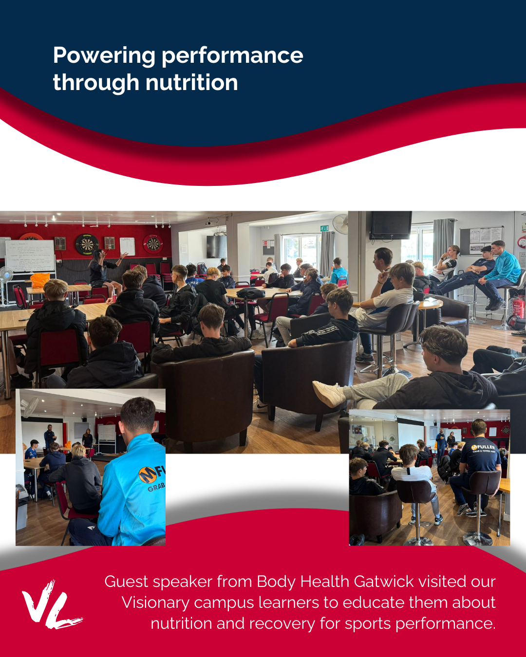 Nutrition & Recovery Posted on 29 September 2025 This week, learners at our VLUK Visionary Campus welcomed a guest speaker from Body Health Gatwick, who delivered an engaging session on the importance of nutrition and recovery in sports performance. Speaking to both cohorts, she explored what athletes should be eating before, during, and after fixtures, as well as effective strategies for recovery. Learners were actively engaged throughout, taking away practical knowledge they can apply both on and off the pitch. For our Year 13 learners, the session provided excellent curriculum links, supporting their current Unit E research proposals on nutritional supplementation, while also acting as valuable pre-learning for the upcoming Unit 4: Nutrition in Sports Performance. This was an insightful and highly relevant talk that left all learners with a deeper understanding of how nutrition and recovery play a crucial role in sporting success.